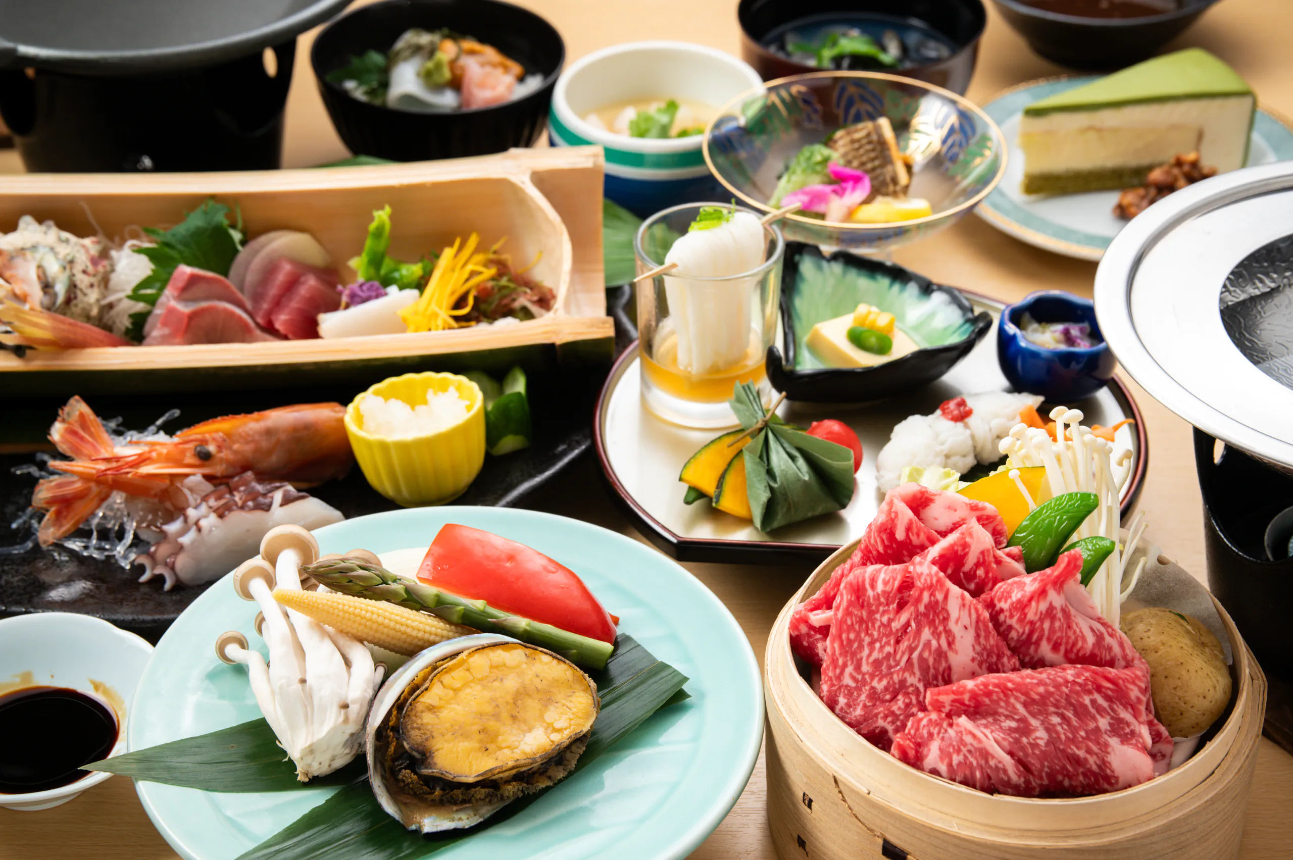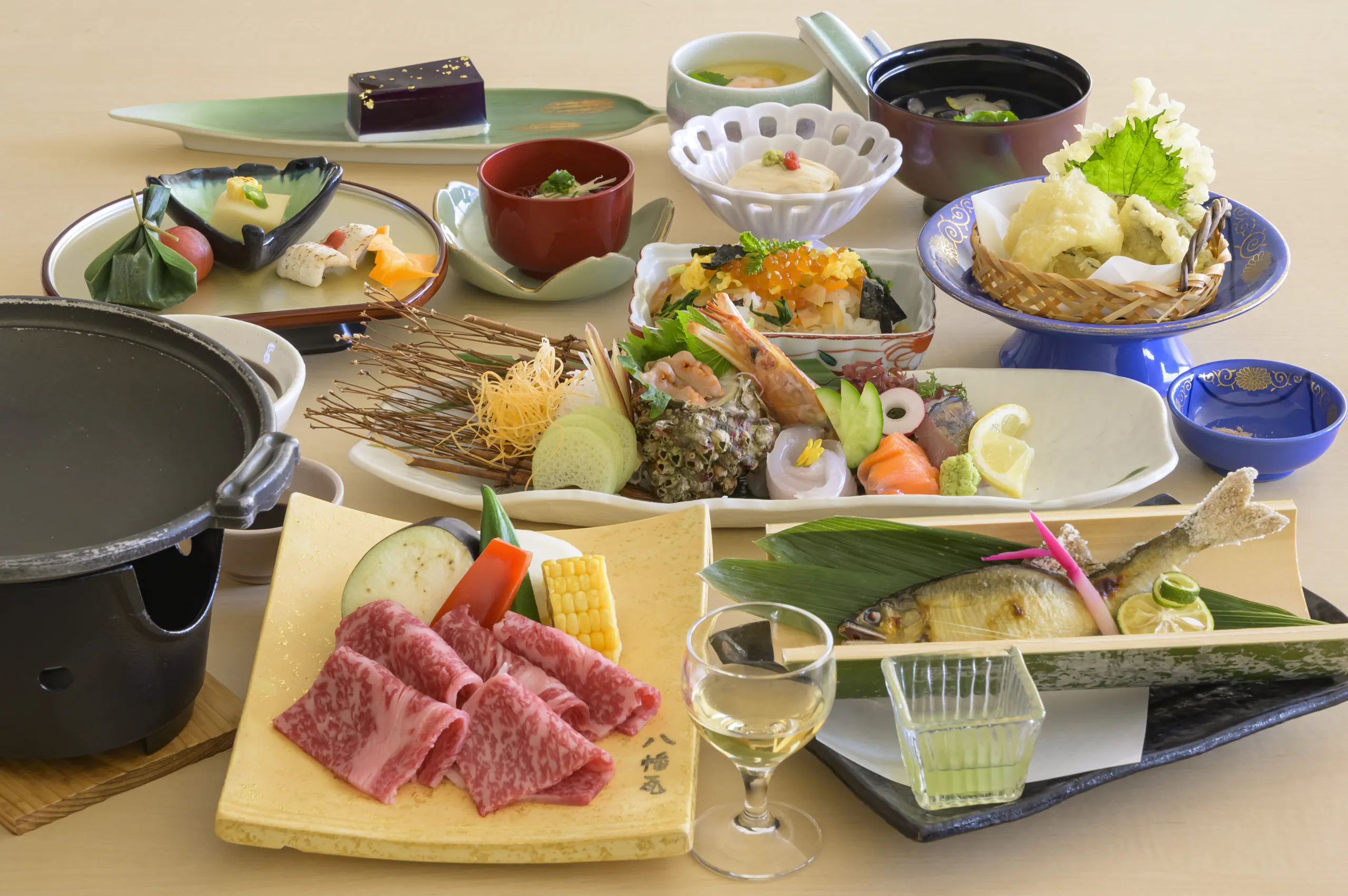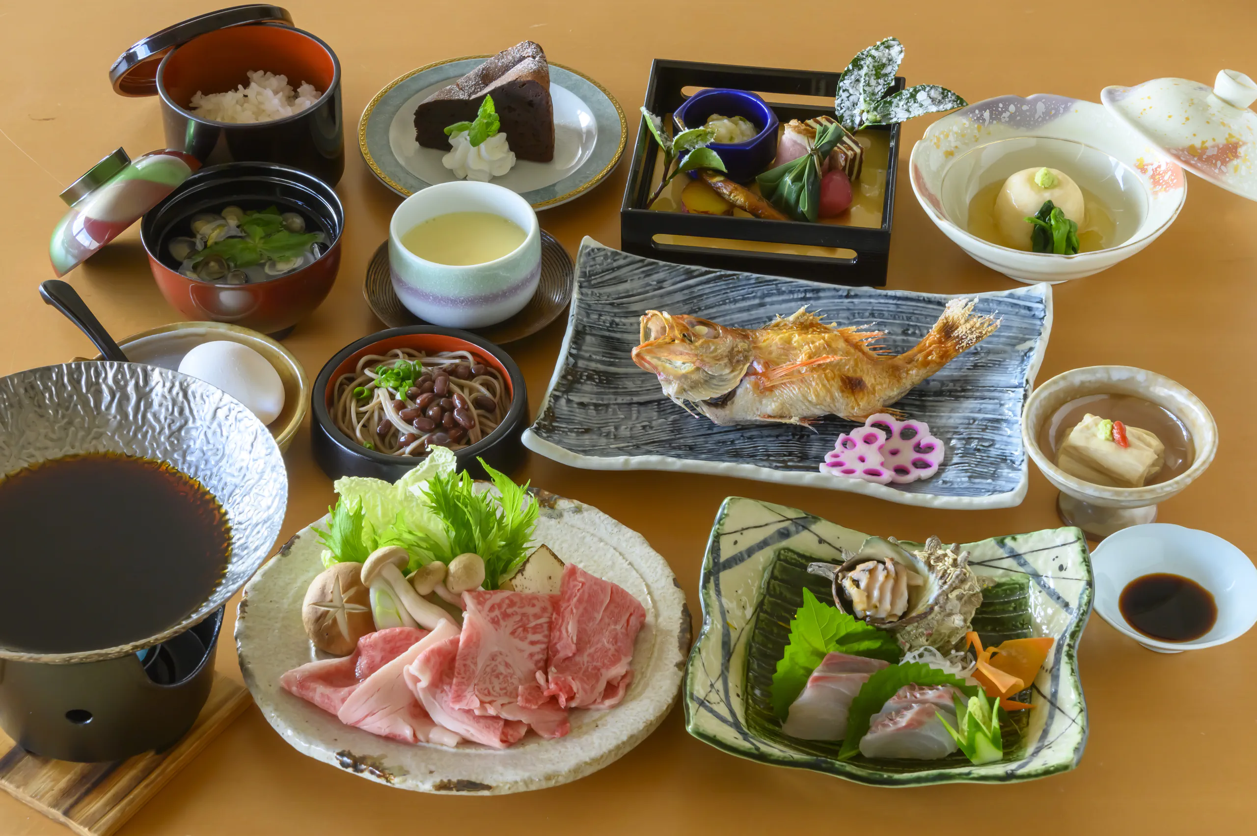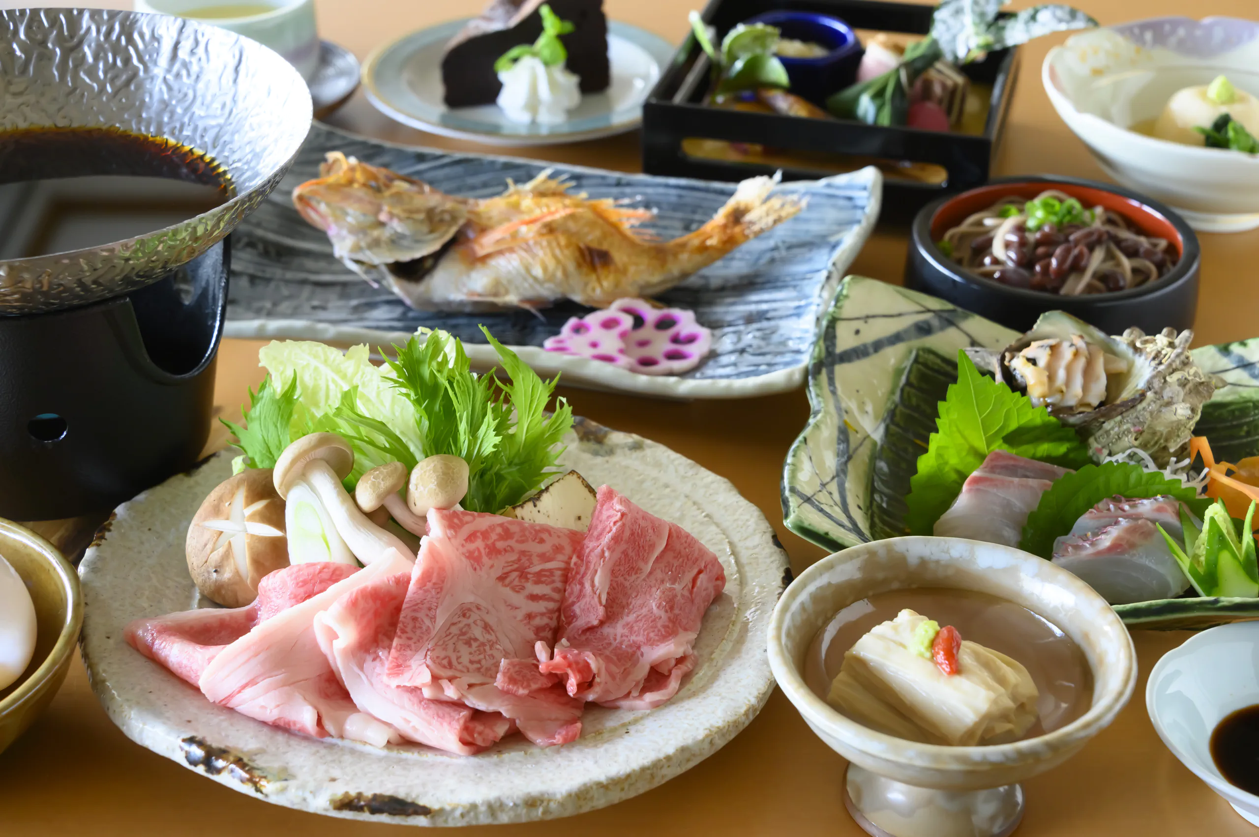 鱸(スズキ)の奉書焼きと国産和牛の焼きしゃぶなど、料理長がこだわり抜いた季節の食材を匠の技で仕上げたお料理の数々が並びます。