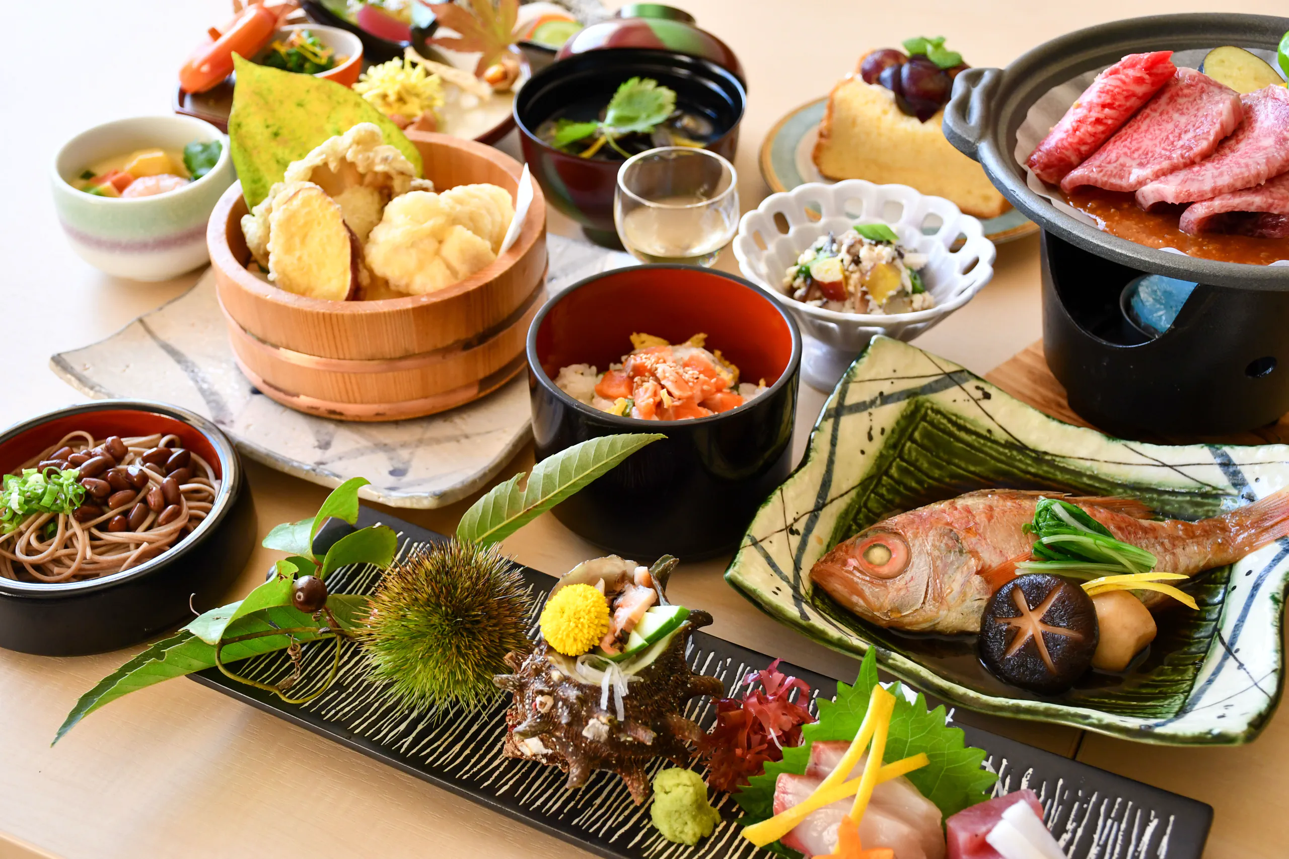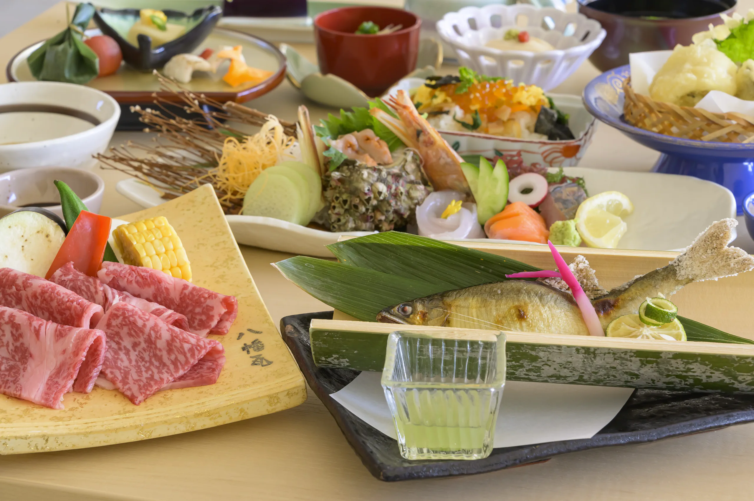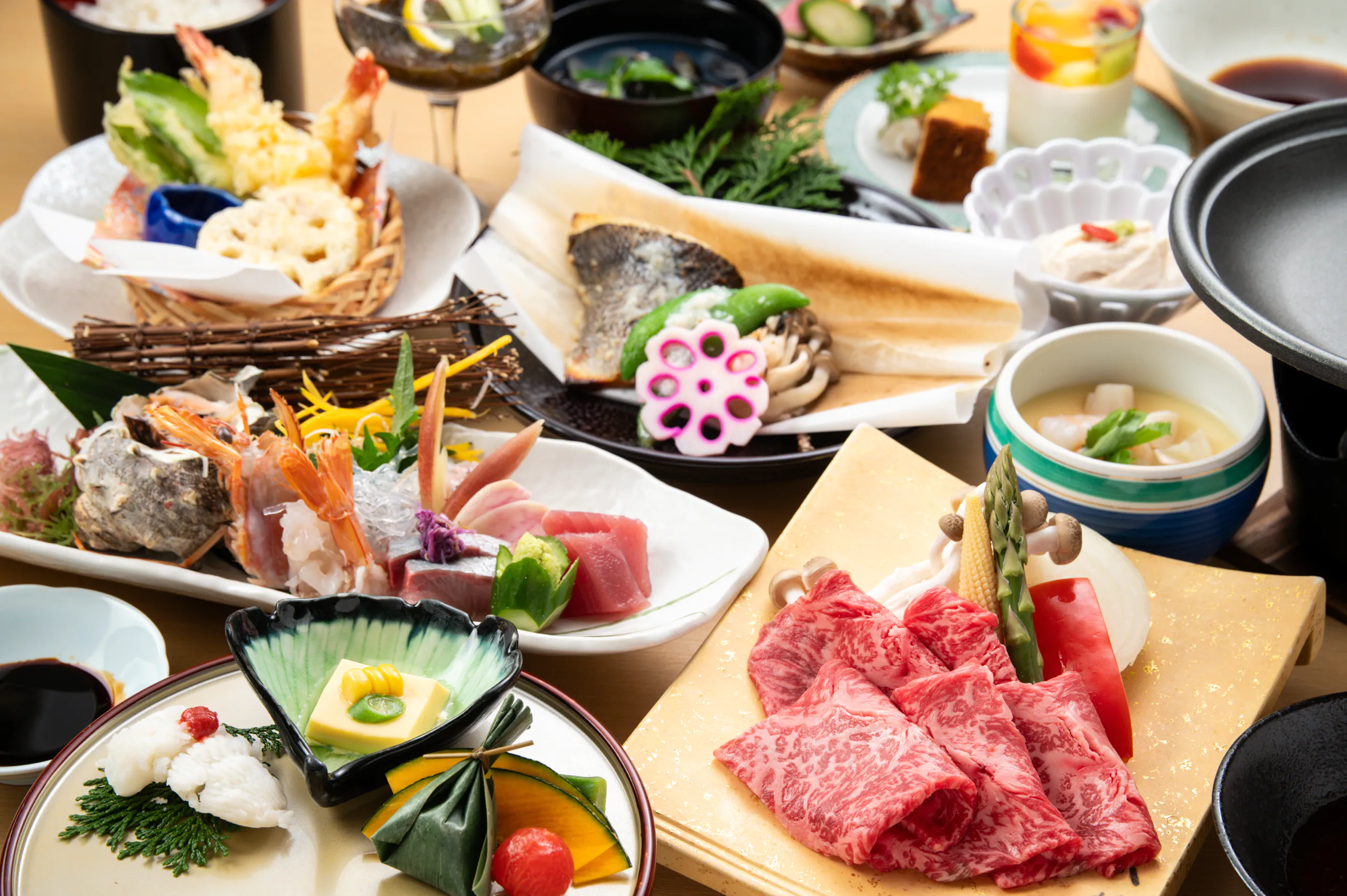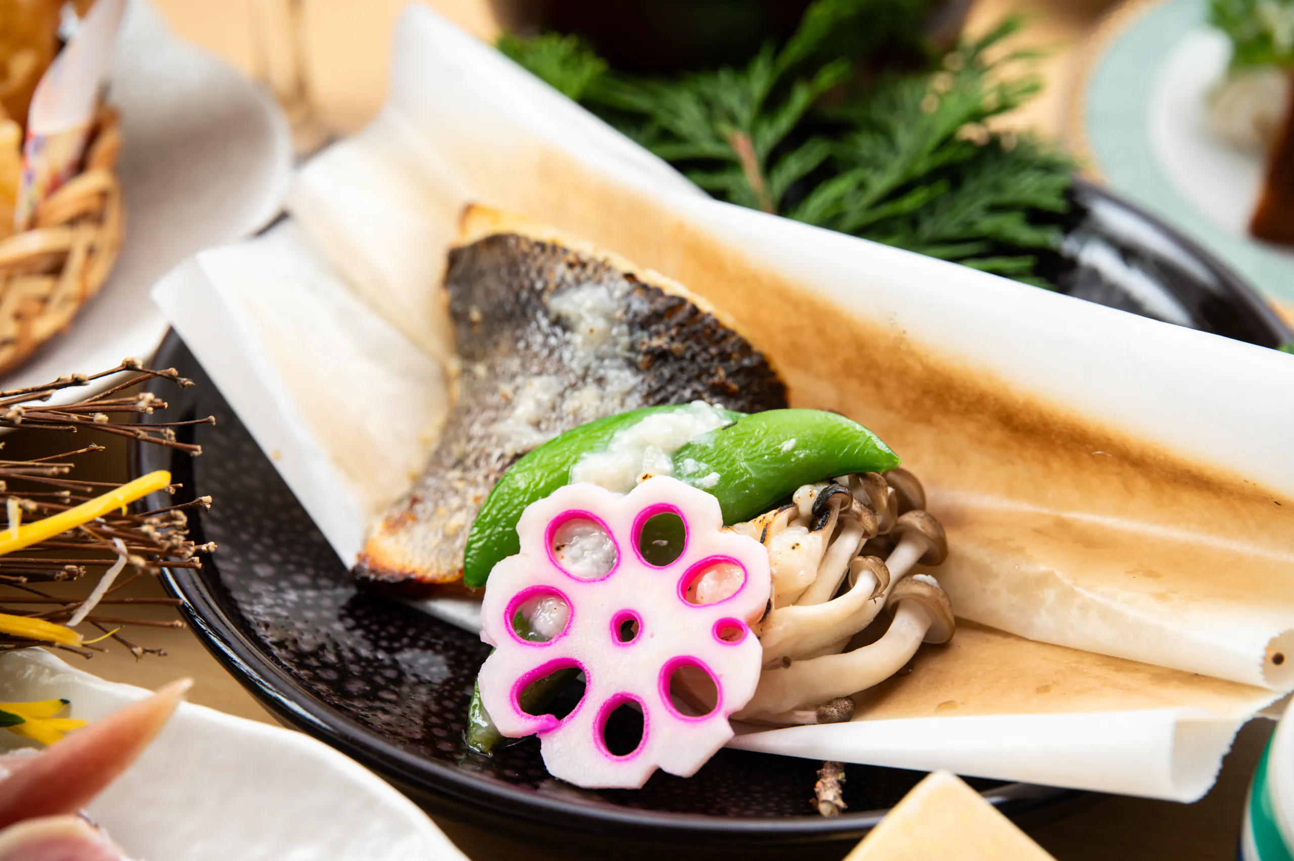 鱸(スズキ)の奉書焼きと国産和牛の焼きしゃぶなど、料理長がこだわり抜いた季節の食材を匠の技で仕上げたお料理の数々が並びます。
