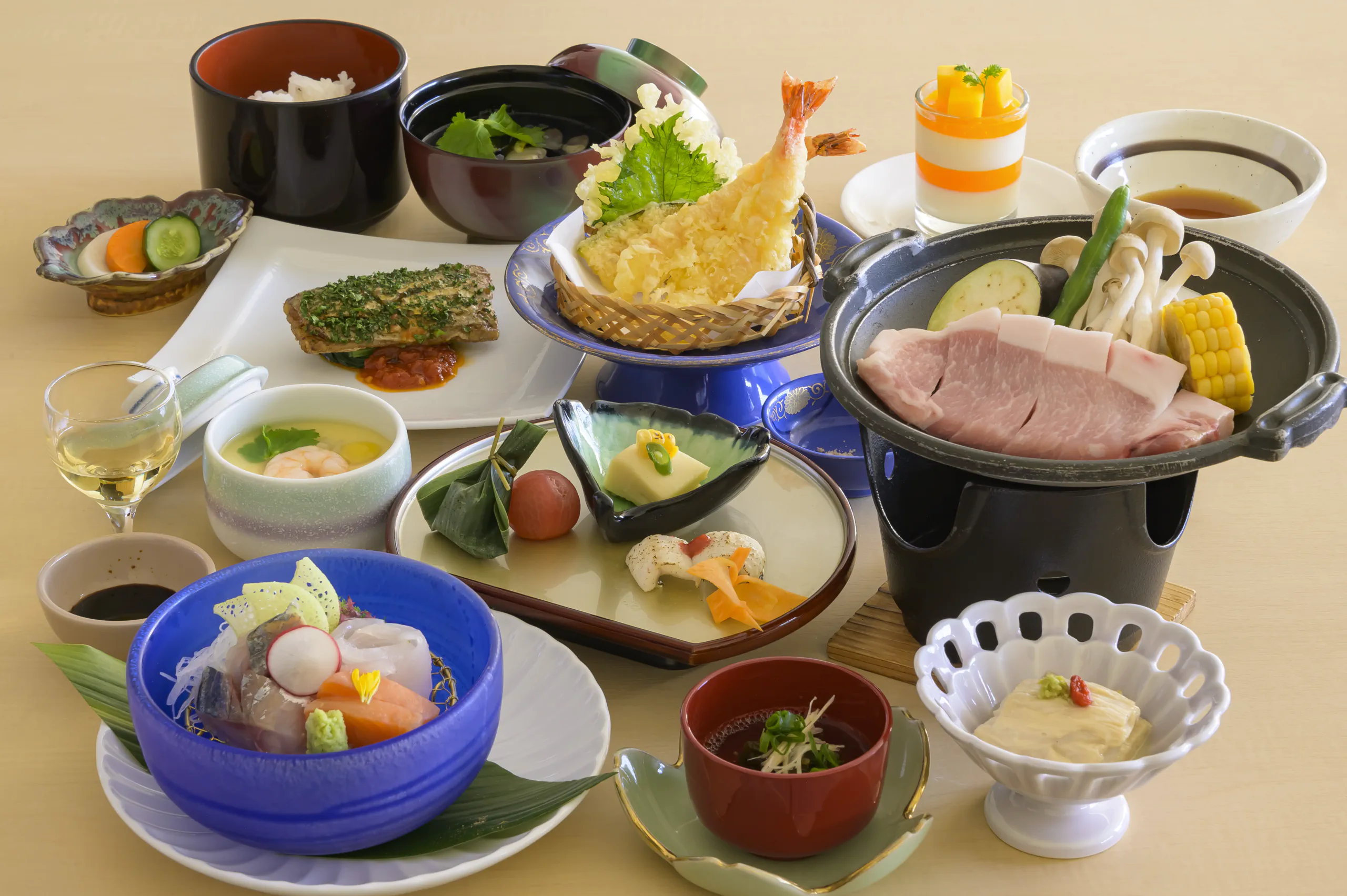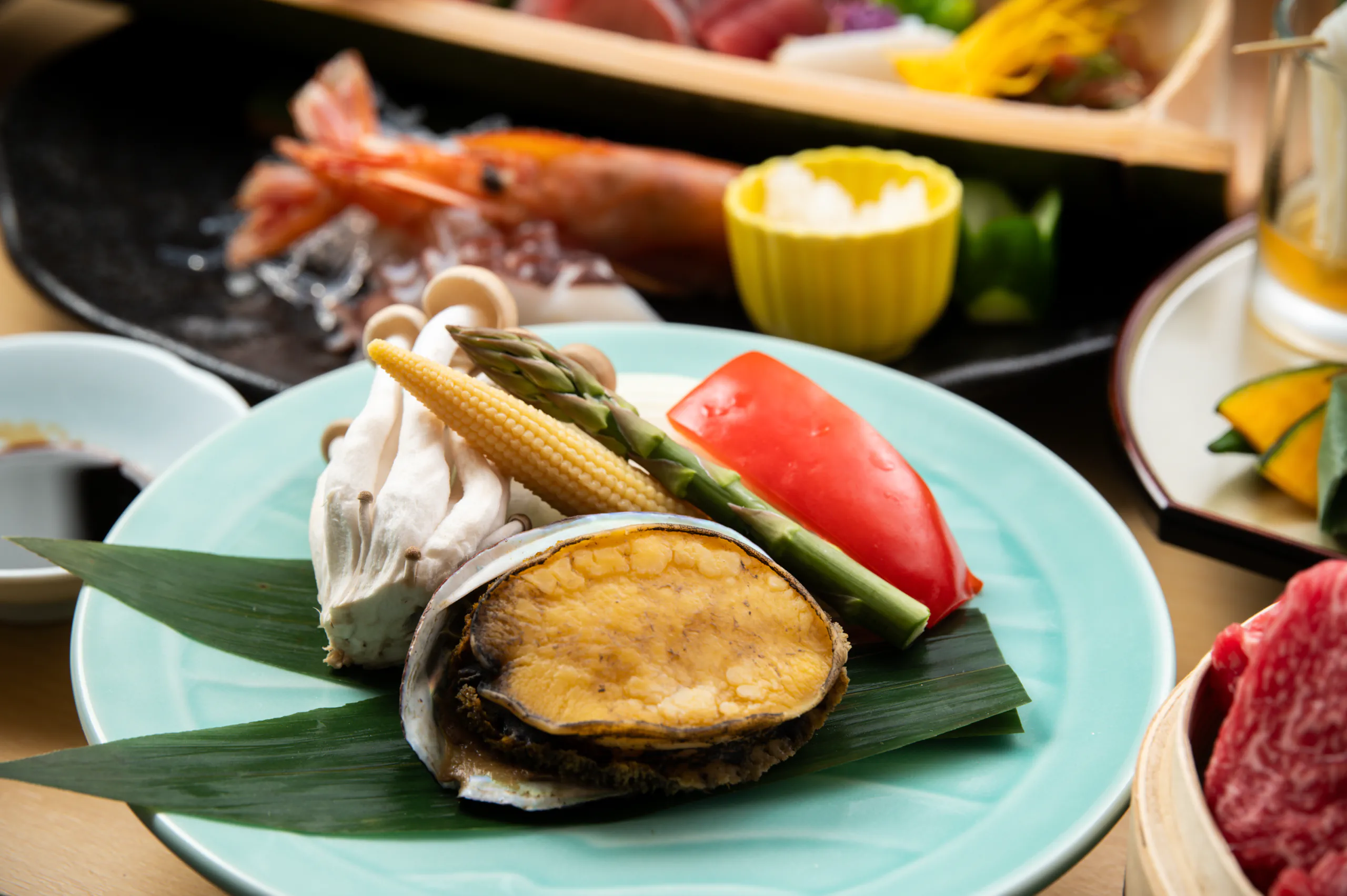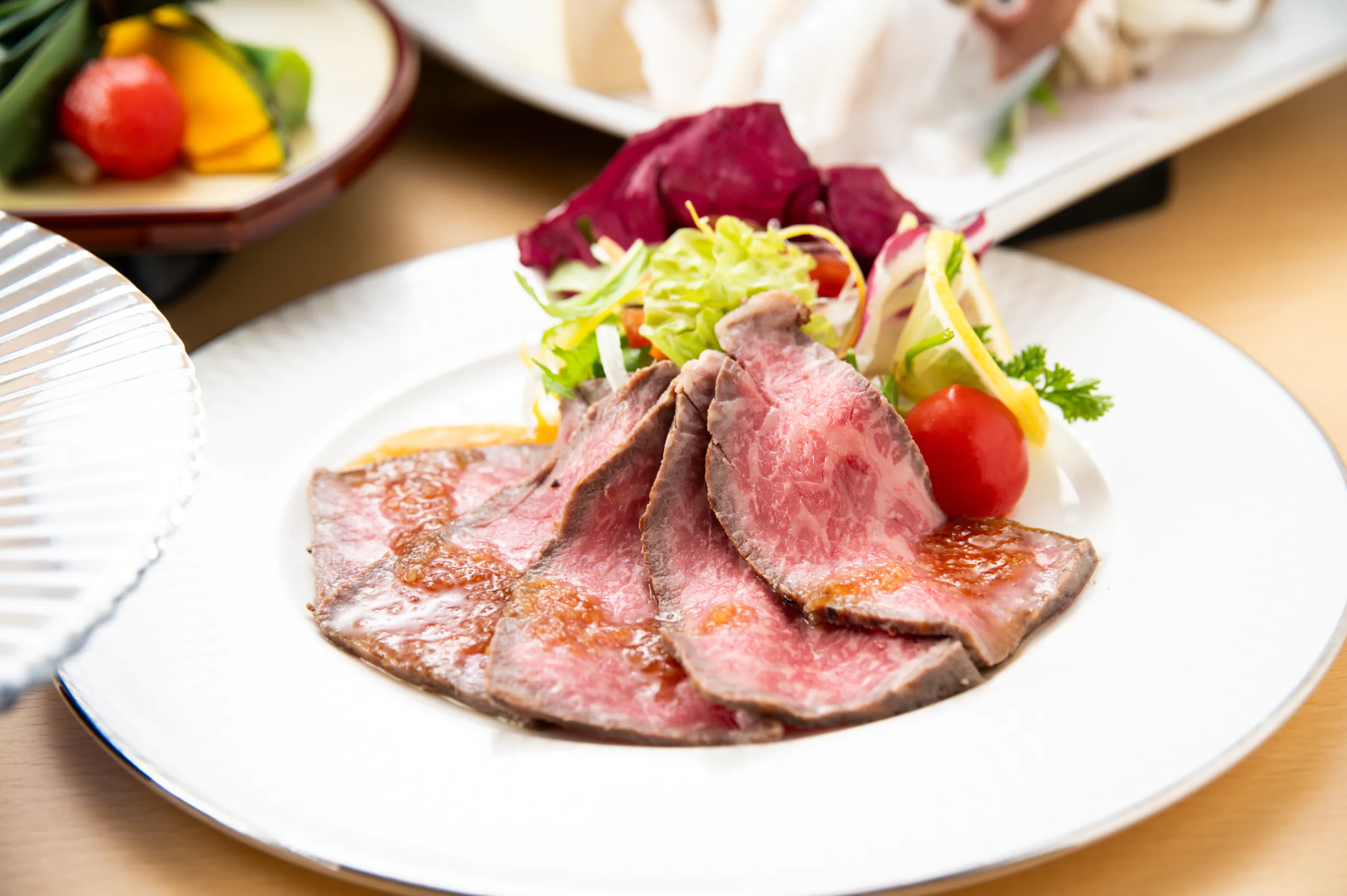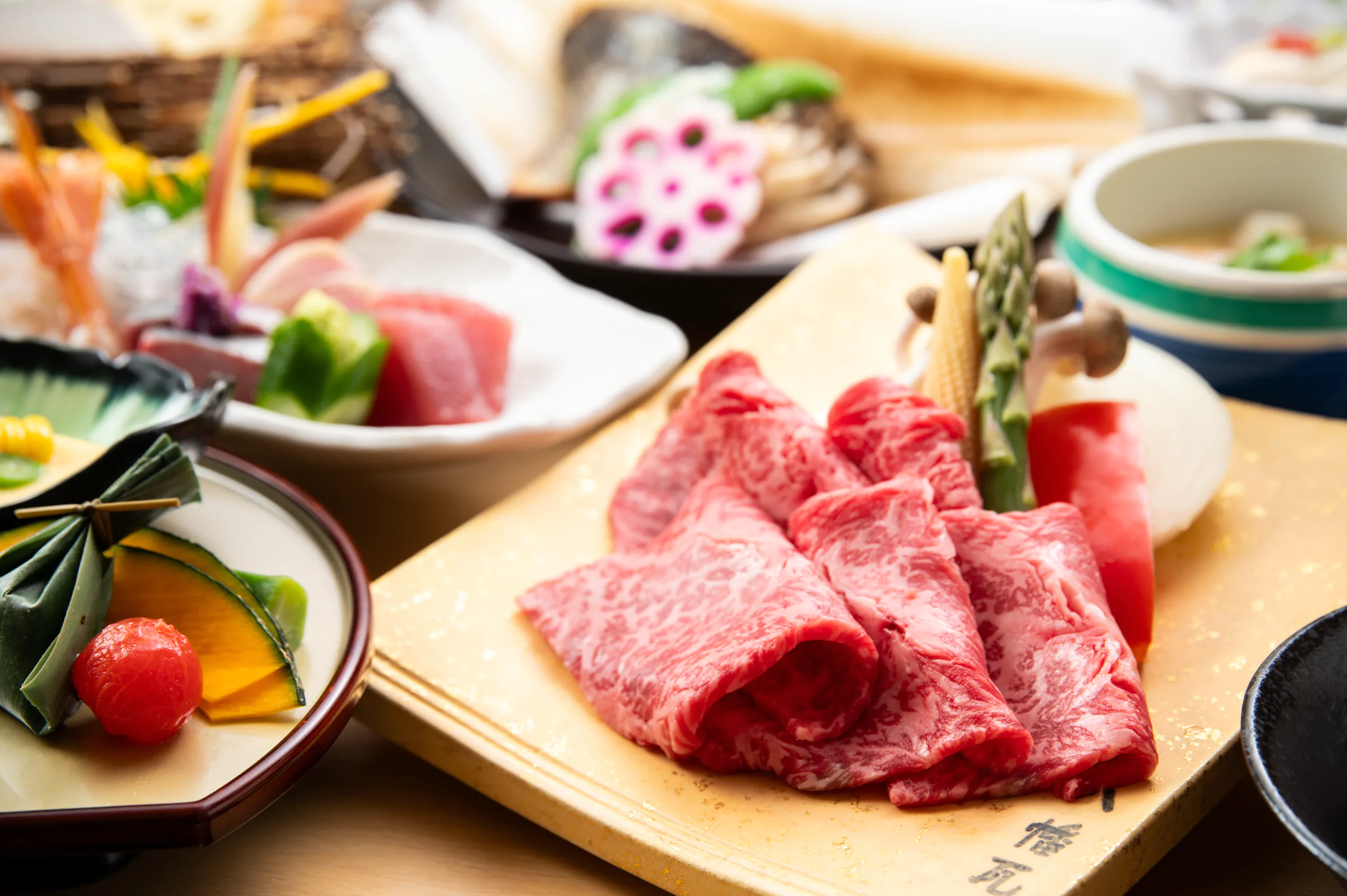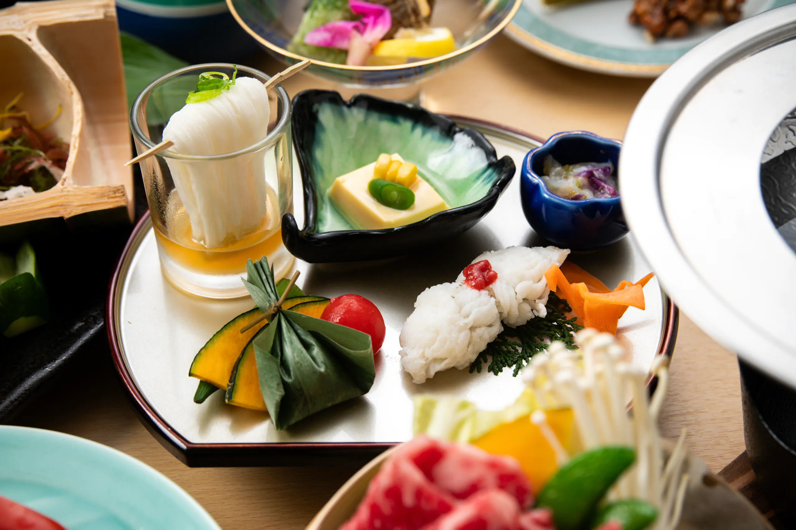 鱸(スズキ)の奉書焼きと国産和牛の焼きしゃぶなど、料理長がこだわり抜いた季節の食材を匠の技で仕上げたお料理の数々が並びます。