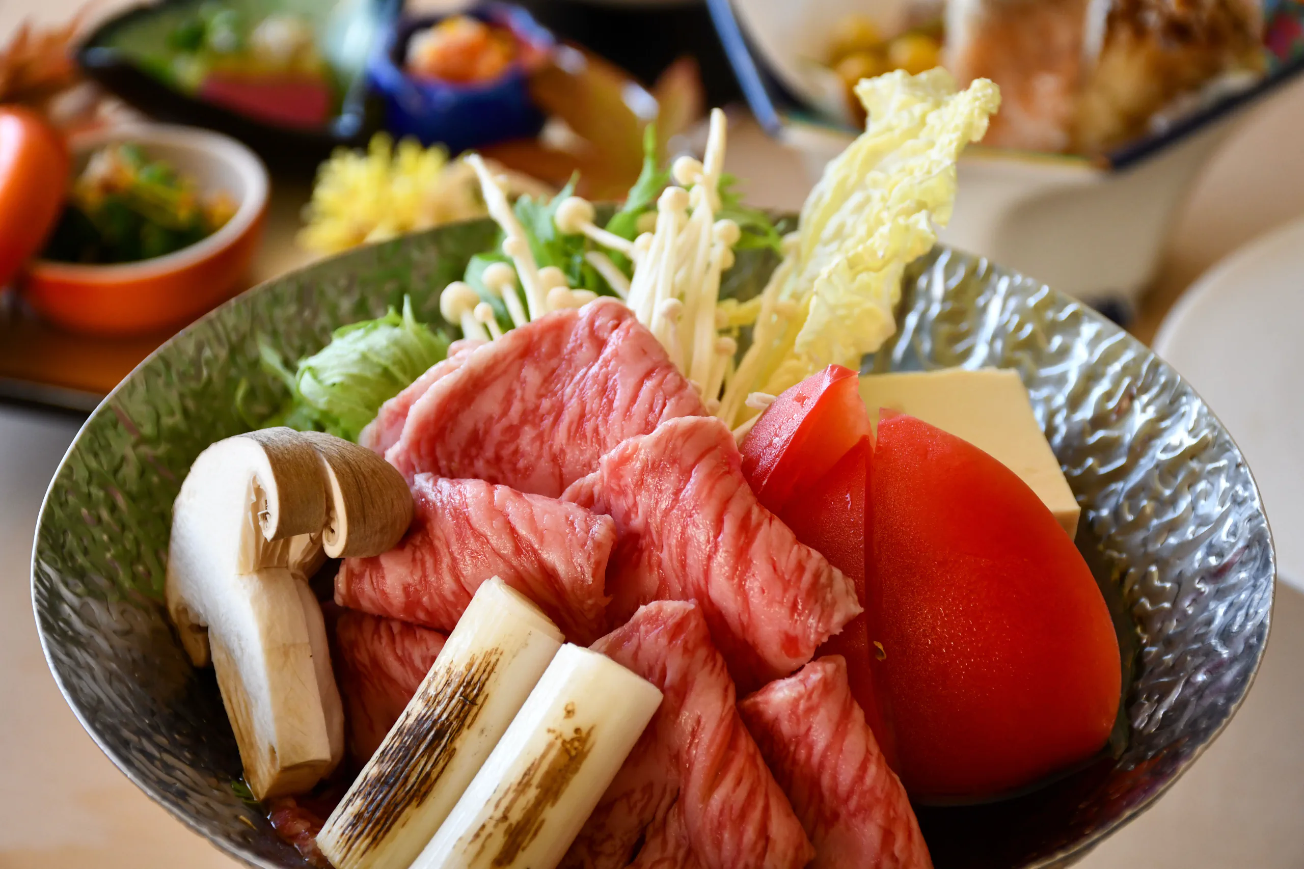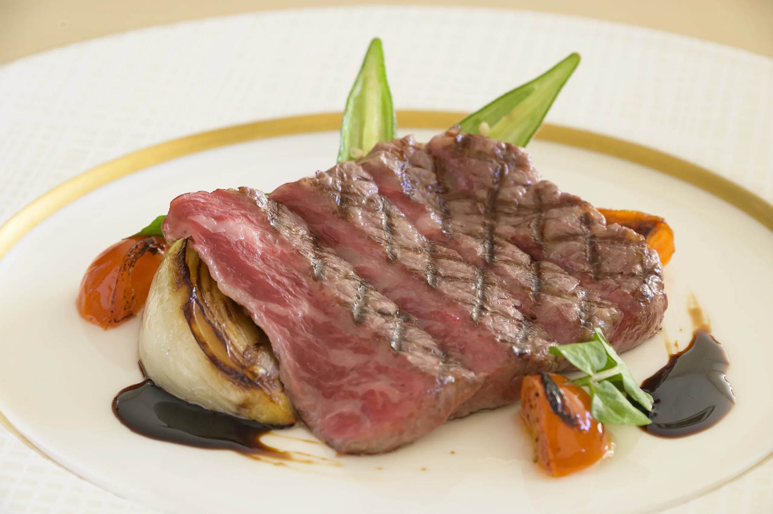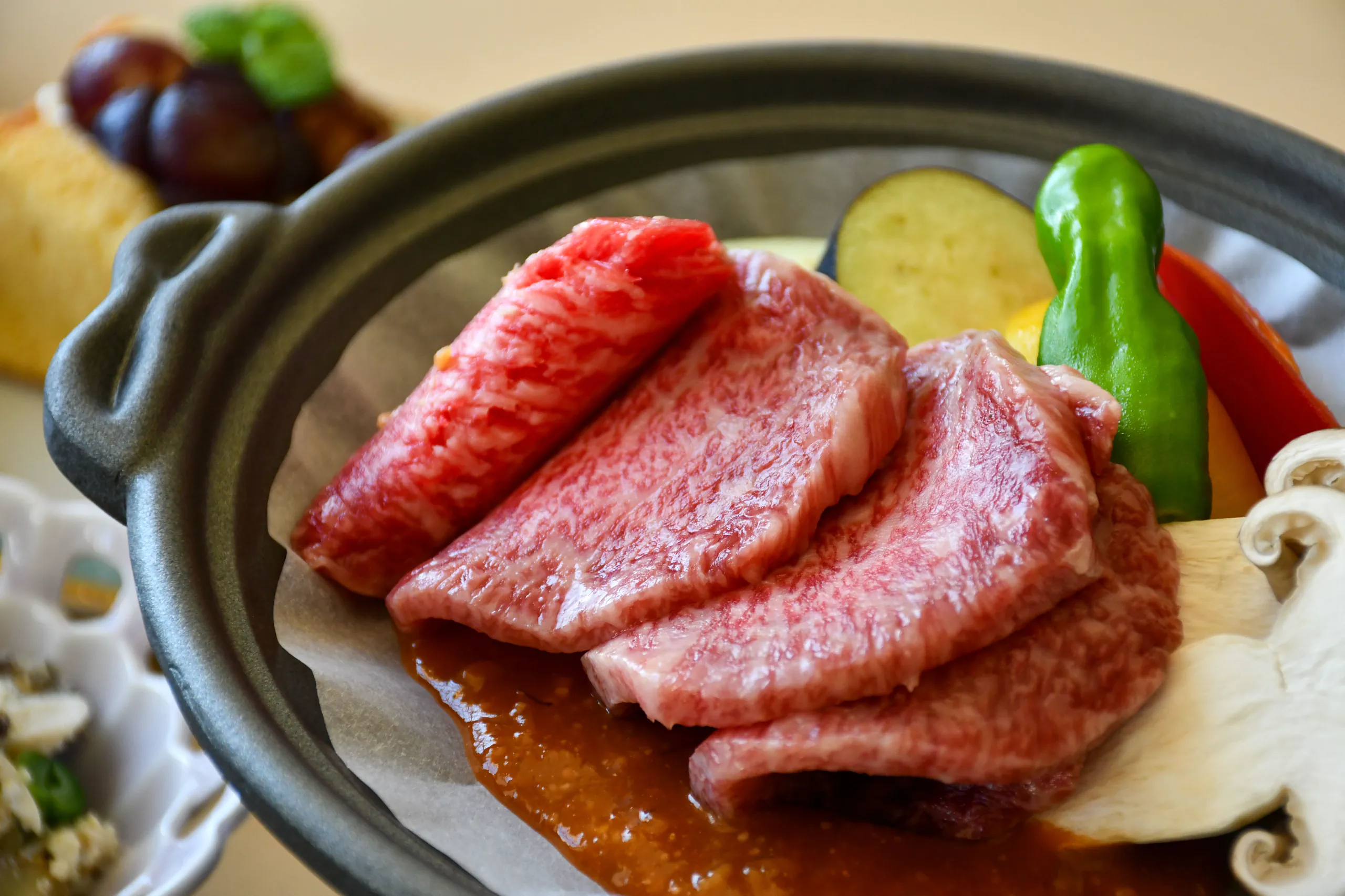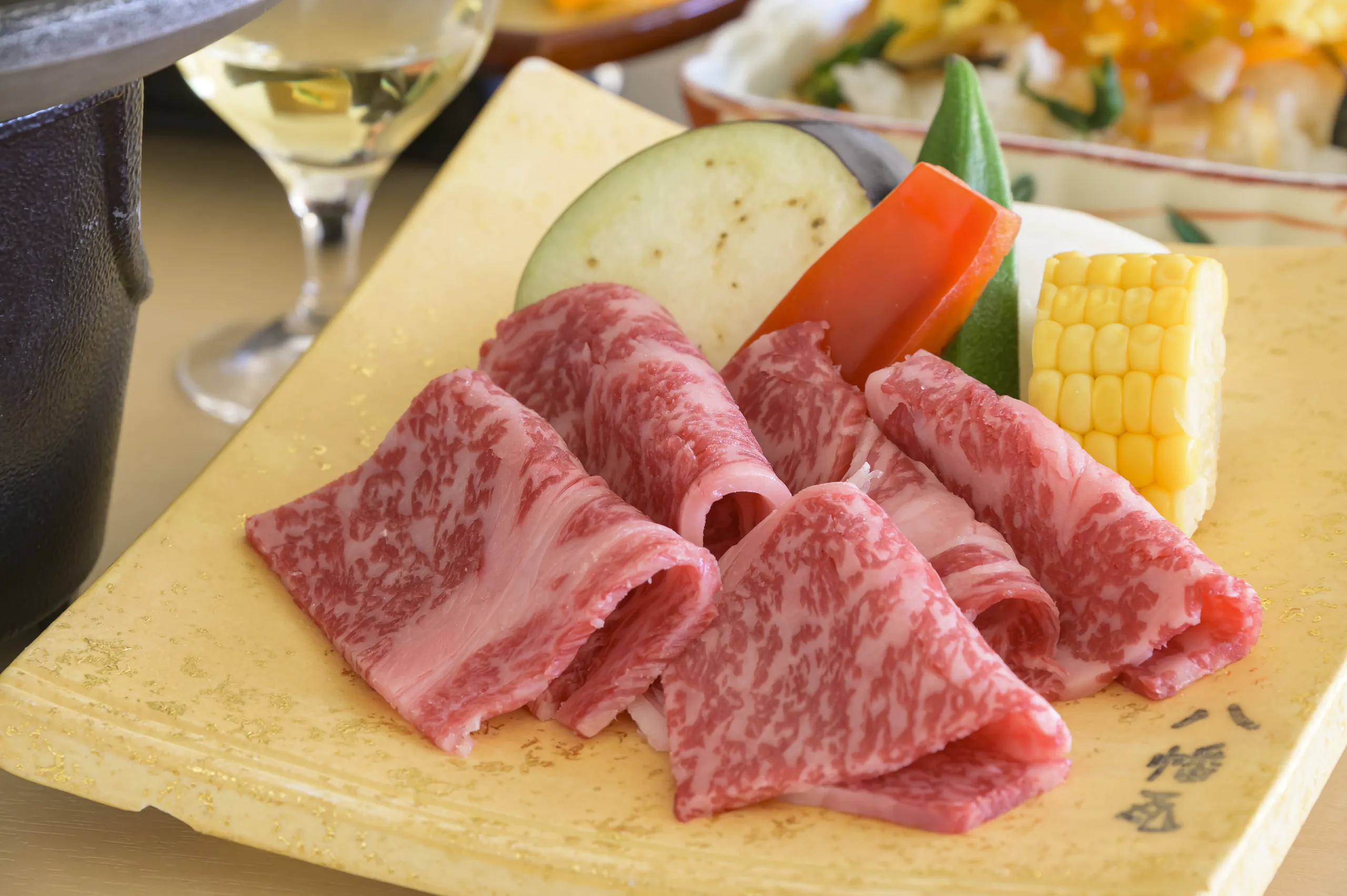 鱸(スズキ)の奉書焼きと国産和牛の焼きしゃぶなど、料理長がこだわり抜いた季節の食材を匠の技で仕上げたお料理の数々が並びます。