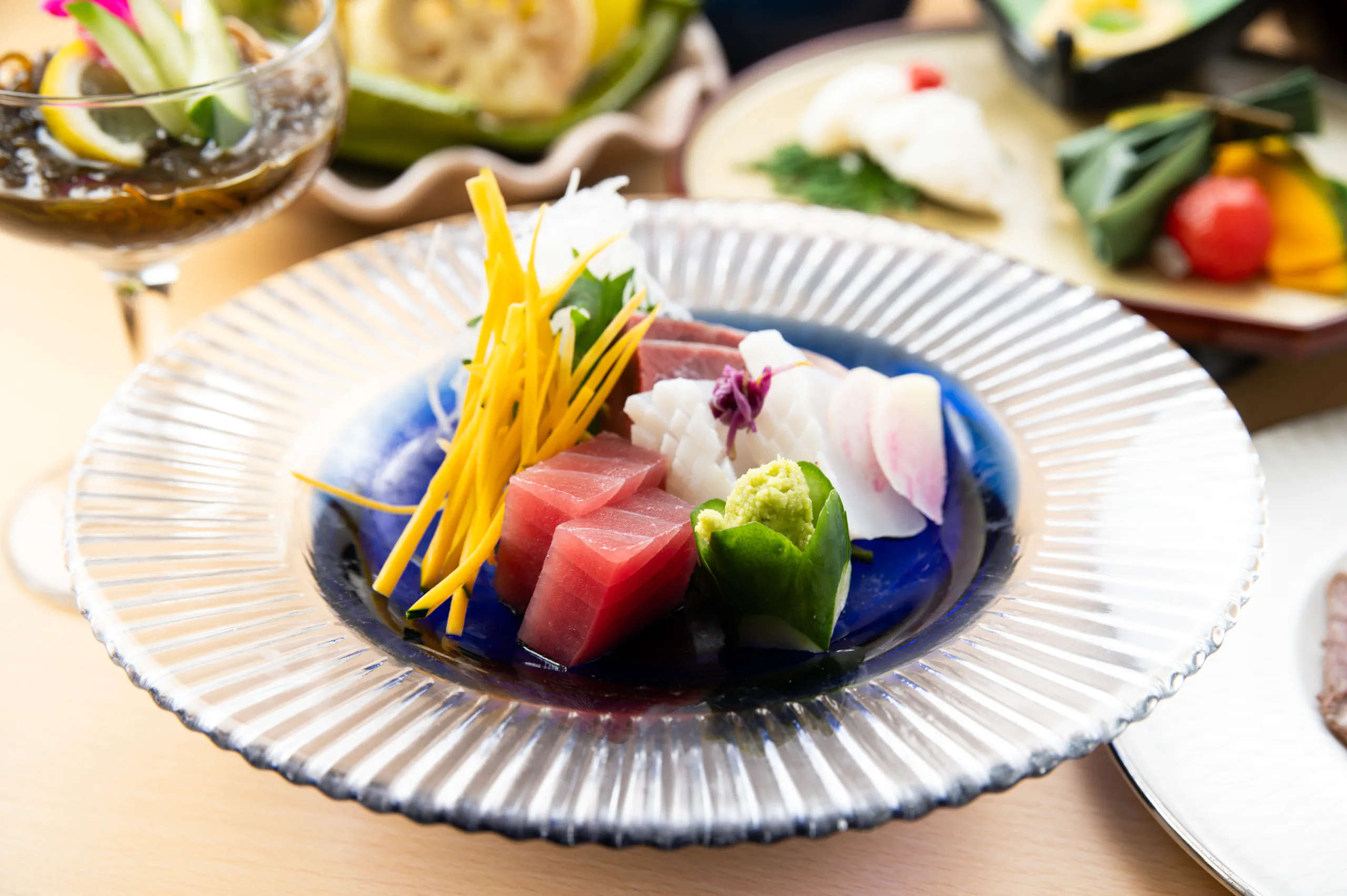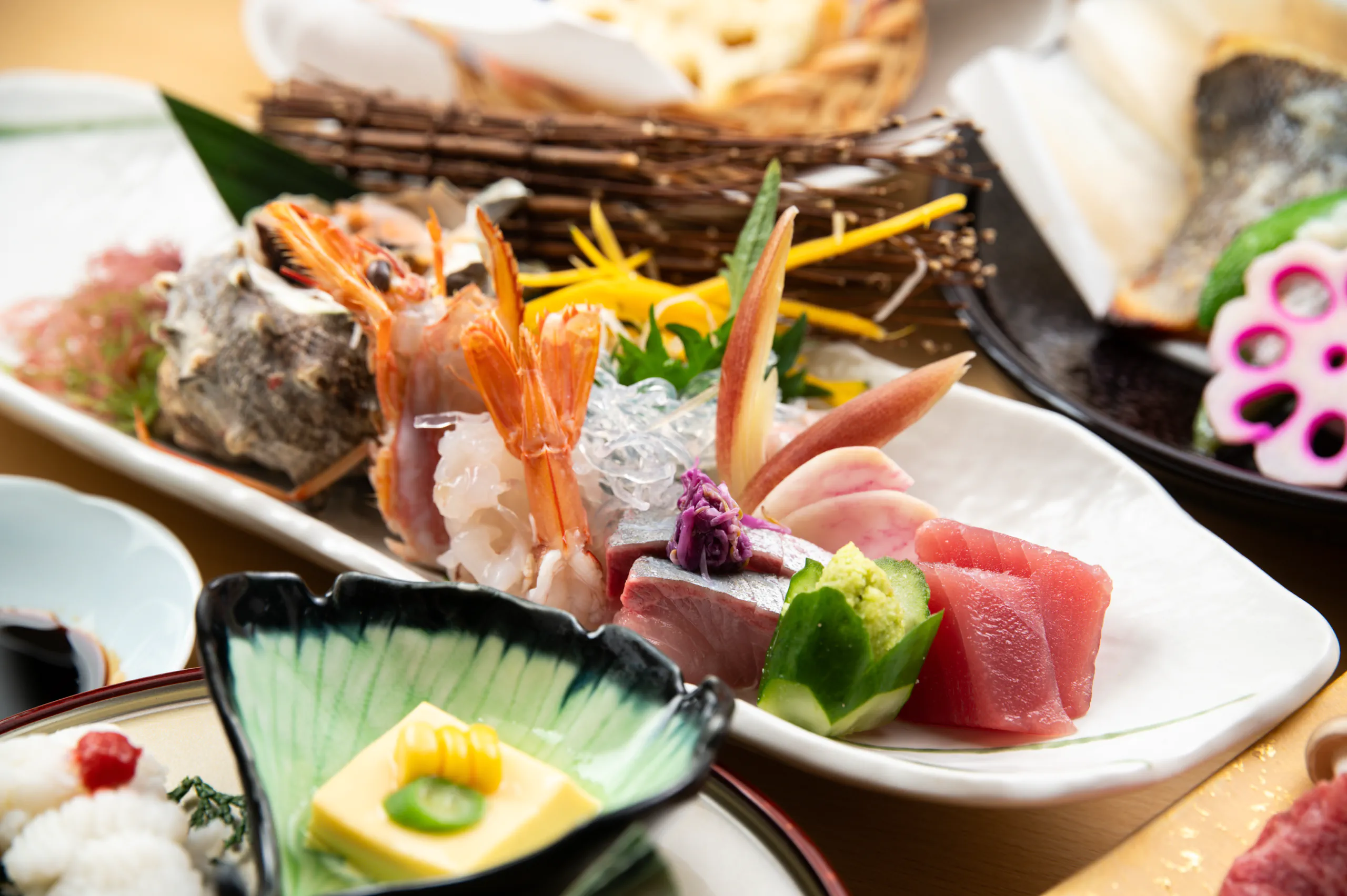 7種の贅沢なお造りに始まり、黒毛和牛の蒸籠、アワビの陶板焼き、雲丹いか丼など季節ごとに変わる珠玉の逸品をご提供いたします。心づくしのおもてなしとともに、忘れられない味をご堪能ください。