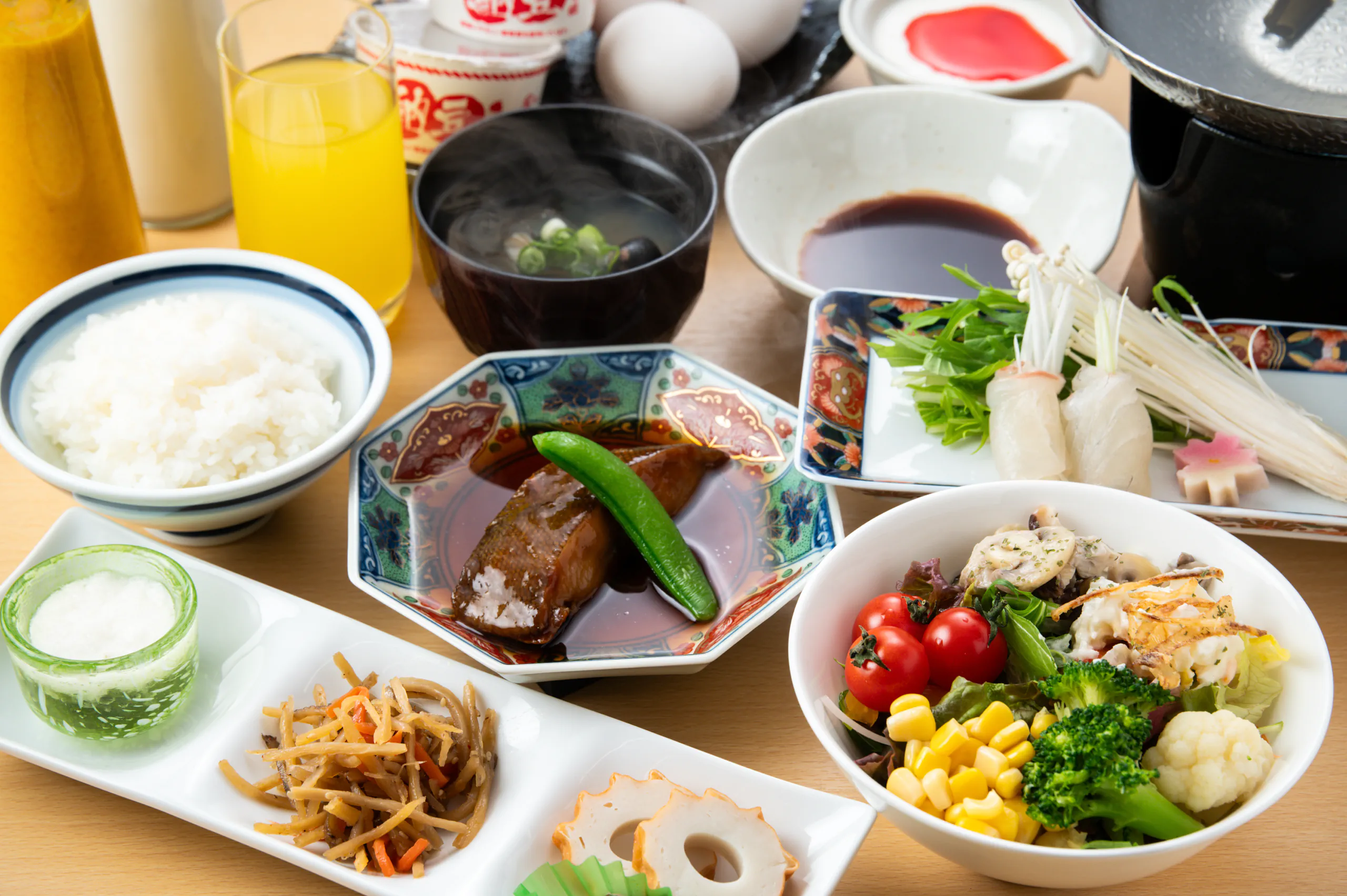 ご朝食には、新鮮野菜をふんだんに用いたサラダや地元産の米をふっくら炊き上げたご飯、魚料理、卵料理をはじめとする和を中心とした料理をご提供しています。名物くにびき鯛しゃぶやしじみ汁も必食メニューです。