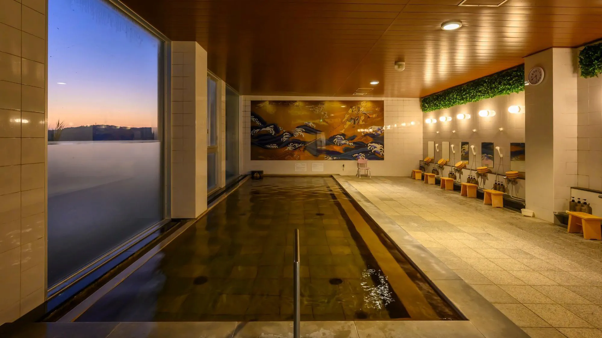 地下源泉からこんこんと湧くナトリウムー塩化物・炭酸水素塩温泉が、大浴場と露天風呂を満たしています。「美肌の湯」と称される湖陵温泉は、保温や保湿効果が高く、冷え性や関節の慢性的な痛みに効くと評判です。